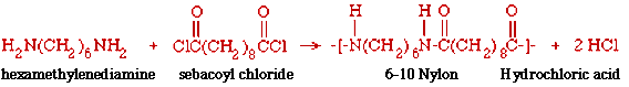 A standard demonstration of the reaction that makes Nylon (a polyamide) uses hexamethylenediamine and sebacoyl chloride. The product is called 6-10 Nylon and consists of alternating units contributed by the hexamethylened iamine (6 carbon atoms) and the sebacoyl chloride (10 carbon atoms).