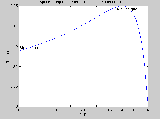 Jim, Well, I told my wife about this problem and her response was "Keep It Simple, Stupid", so I will try my best. I pulled out my trusty design book (Mechanical Engineering Design by Shigley & Mischke, 5th edition. pg. 670) and looked at the formula for power transmission in a flat belt. This seemed like a decent model for your conveyor problem. The simplest model states that power P = (F1 - F2)V. Where: P = power transmitted by the belt (in Watts) F1 = tension in drive side belt (in Newtons) F2 = tension in return side belt (in Newtons) V = belt velocity (in meters/second) To convert to horsepower the equation simply becomes Hp = (F1 - F2)V / 33,000. This corresponds to the common equation for power of P = F*V. Ignoring a number of things that I will get into later, let's assume that the horsepower output of our 5 Hp motor is 5 Hp. And you gave us belt speed at 150 feet/min. which is .762 m/s. So we can solve for our tensions with 5 = (F1-F2)*.762 / 33,000 (I'm being careless and not writing units to make readability better but it is always a good idea to write your units in the equation to ensure you are not adding apples and oranges). Anyway, solving for (F1-F2) = 216,536 N . Now that we have a figure for that, we can plug it back in to the original equation and solve for an unknown V. This is Hp = 216,536*V / 33,000 = 6.56*V where V is again in m/s. Using 1 m/s = 196.85 ft/min we can write the equation as Hp = .0333*V Where: Hp = Horsepower V = belt speed in ft/min Therefore, for test, .0333*150 = 4.995 which is very close to our original 5 Hp. For a 10% increase, V=165 ft/min and therefore Hp = .0333*165 = 5.5 Hp. For 20% V= 180 and Hp = 6 and for 30% Hp = 6.5. Since the relationship is linear, it makes sense that for every 10% increase in speed, horsepower increases by 0.5. Now that is the simple explanation and it may be good enough for what you are doing, but it may not be right, and here is why. I don't know the application and I don't know the characteristics of your motor. I assume it is a three phase induction motor running at 240V of 480V. What I don't know is the current. If I had the current and the voltage we could solve for the REAL power being used to drive the belt. With a few more characteristics, we could have better idea of the torque characteristics of the motor as well. The torque curve for an induction motor looks like the following curve. I copied this from the Virginia Tech website that had an AC motor section that was over MY head. But the visual is important to understand.Now first off this is a picture of a typical curve, not necessarily for your motor. The important parts are the starting torque, max torque, and one that isn't shown, rated torque. Slip refers to (essentially) rotor speed, or RPM. So starting torque is when RPM is zero. This is usually greater than the rated torque so that the motor can spool up to its operating speed. (If the initial load is greater than the starting torque, the motor would never move and burn up.) The max torque is usually at a slower RPM than the operating RPM. This is so that a motor can accommodate larger loads by slowing down instead of stalling. The part that isn't shown is the rated load. This is sometimes (but not always) the output stated on the motor. This is located on the far right part of the curve somewhere below the starting torque and the max speed at T=0. The last section is the synchronous motor speed when torque equals zero. This is the max speed of the motor with no external loads (the furthest right of the curve). This is pretty much the speed of the motor if you just plugged it in and ran it with no load. So, by looking at this curve and without knowing the characteristics of the motor or the current it uses, we don't know where on this curve we are. Somewhere faster than max torque and slower than max speed. What this means is that for a given torque load, a motor has an RPM associated with that load and will happily turn at that speed regardless of if it is ½ Hp or 4.5 Hp being used. So without knowing details, it is possible (in fact probable) that a 5 Hp motor with different curve characteristics would drive the belt faster. However, if you use the same type of motor with the same speed rating and higher power, the above equations should be valid for an estimate. Hope this helps and wasn't too confusing. If you need additional help you can always write me at bradk@jymis.com. Good luck and feel free to ask me for additional assistance. BK