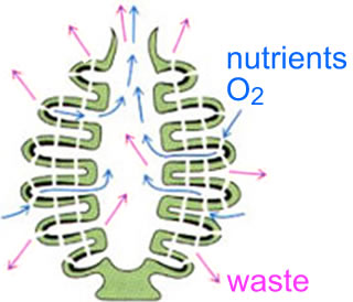 Compared to single celled organisms, the size and structural complexity of multicellular organisms (metazoans) leads to issues associated with the import of nutrients and oxygen, and elimination of waste molecules and carbon dioxide. In the simplest of metazoans, such as sponges, both import and export can are occur through passive diffusion of molecules into and out of cells. This is because such organisms are only a two to three cells thick. |