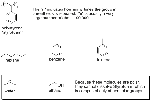 I should note that in Styrofoam (because the benzene groups have strong covalent bonds to the polymer backbone) the benzene groups will not come off (dissociate) when dissolved in any solvent.