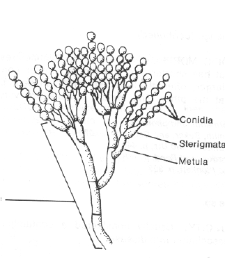 It is quite possible that the bluish mold is Penicillium. Penicillium species are common food contaminants, found growing on cheeses. A "text book" colony morphology of Penicillium is as follows: The surface might at first appear white then becoming very powdery, turning bluish-green with a white border. If you have access to a microscope and some staining solutions you could look at the cellular morphology of your suspected Penicillium isolate. I have included a scanned diagram of the cellular morphology of Penicillium. Shown in the diagram is the spore formation that is indicative of Penicillium species. The spores known as conidia are held to hyphae by structures known as the sterigmata and metula. The picture is taken from "Medically Important Fungi: A guide to Identification" by Davise Honig Larone.![]()