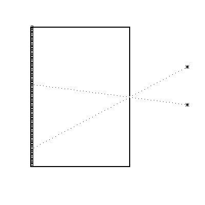 Evidently you could double the amount of light by cutting a second hole (Figure 2) in the aperture screen, but at a serious price: stars in the image plane would appear double (separated, we should notice, by a characteristic fixed interval), and images of complex objects would seem to be quite confused. With more holes, things would get even worse. At first this seems an unpromising approach! However (in an early form of coded aperture proposed by R. H. Dicke in 1967), suppose we make the "opaque" screen (the coded aperture, or mask) a large array of random pinholes, so that each position has a 50% chance of being open or blocked. Now the image is really a mess (I won't even try to draw a picture), although there is plenty of light. But look: if we make an identical copy of the mask (the decoder), and slide it around over the image plane, a very interesting and wonderful thing happens. If the decoder is accidentally in a position such that a star shining through a hole in the mask on the right happens to shine on through the same hole in the decoder on the left, then every hole in the mask will align properly for its corresponding hole in the decoder, but only for that one star.