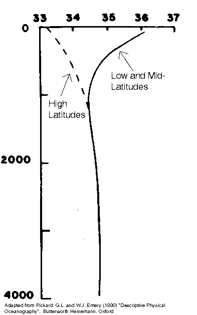 As you can see, at higher latitudes (i.e. to the north) the surface waters are less salty (from freshwater input), while at lower latitudes (i.e. towards the equator) surface waters are more saline (due to evaporation). Salinity in the deep waters is about the same.