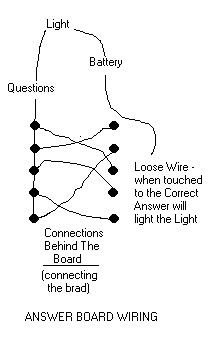 One set of connections that will work is shown in the attached sketch. The wiring behind the board connects the question with its correct answer, and when the loose wire or nail or whatever is used as a stylus touches the brad associated with the correct answer, it completes a circuit through the battery and the lamp.