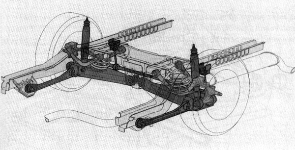 Here is a simple front-view drawing of a multi-link front suspension (this particular type of suspension is called short/long arm or SLA).