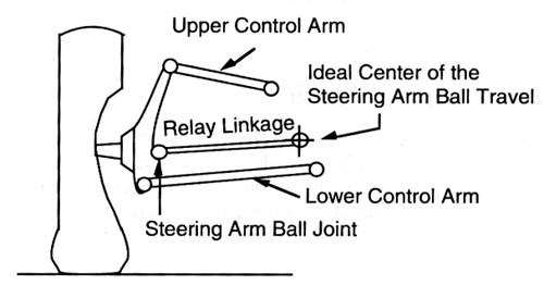 From this view, we can really start to understand how the linkages work to control tire camber. You may want to try building your own suspension model using some strips of cardboard, brads, and this picture. That way you can have your own working model to study. This picture also shows the tie rod which is used for steering, but you don't have to put that in your model. It may sound stupid, but I actually had to do this as a homework assignment in college for my class on machines when we were studying linkages, and it really helps you understand what is going on. Just use a piece of cardboard to represent the upper arm, lower arm, spindle, and the rest of the car. Put the brads at each of the circles and start playing. If you wanted to get real fancy, you could actually try to make the spindle piece look like it has a tire attached to it.